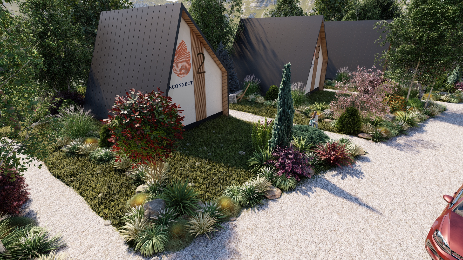 Crearea unui peisaj natural care susține confortul și intimitatea unei stațiuni de cabane.