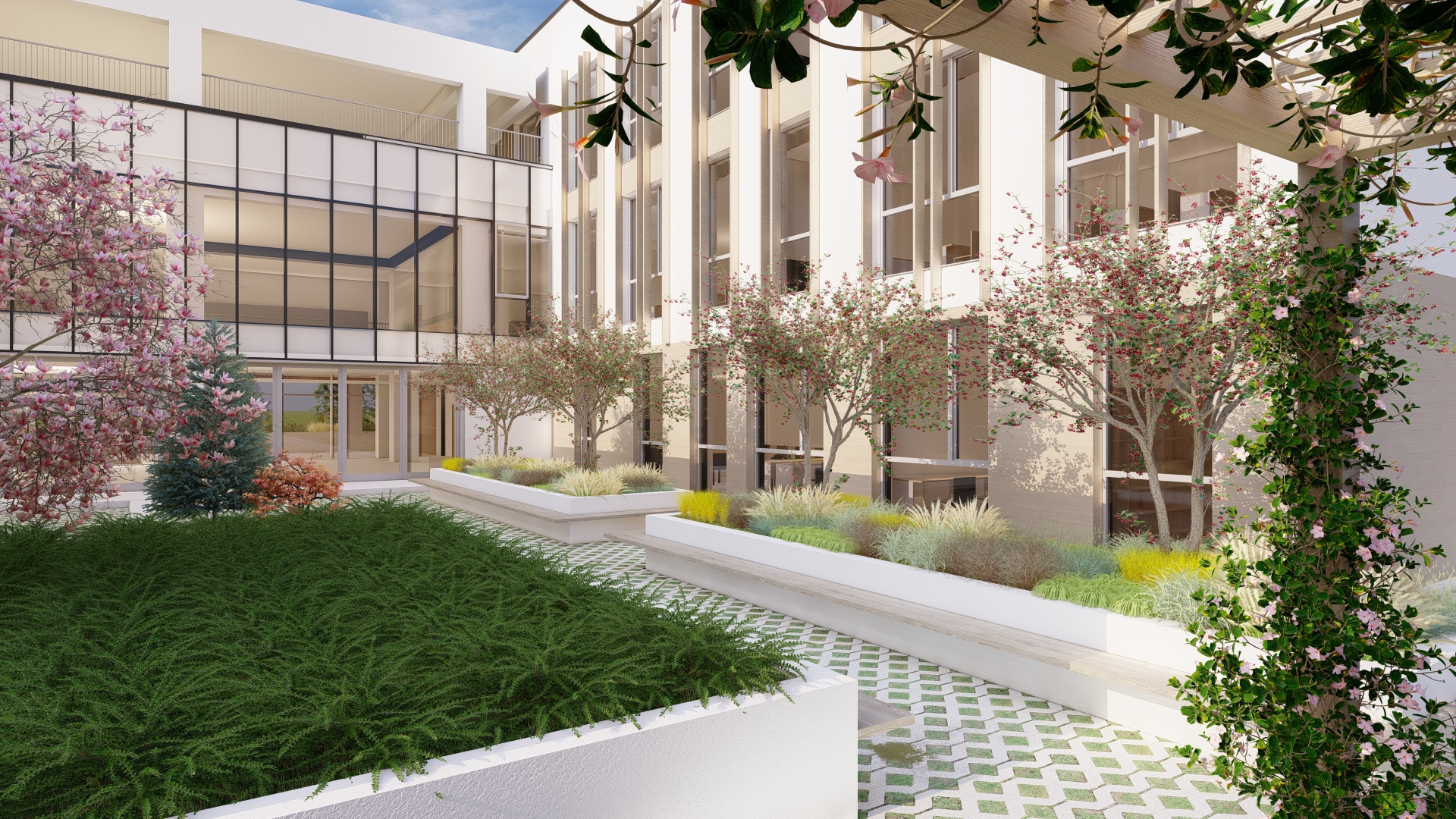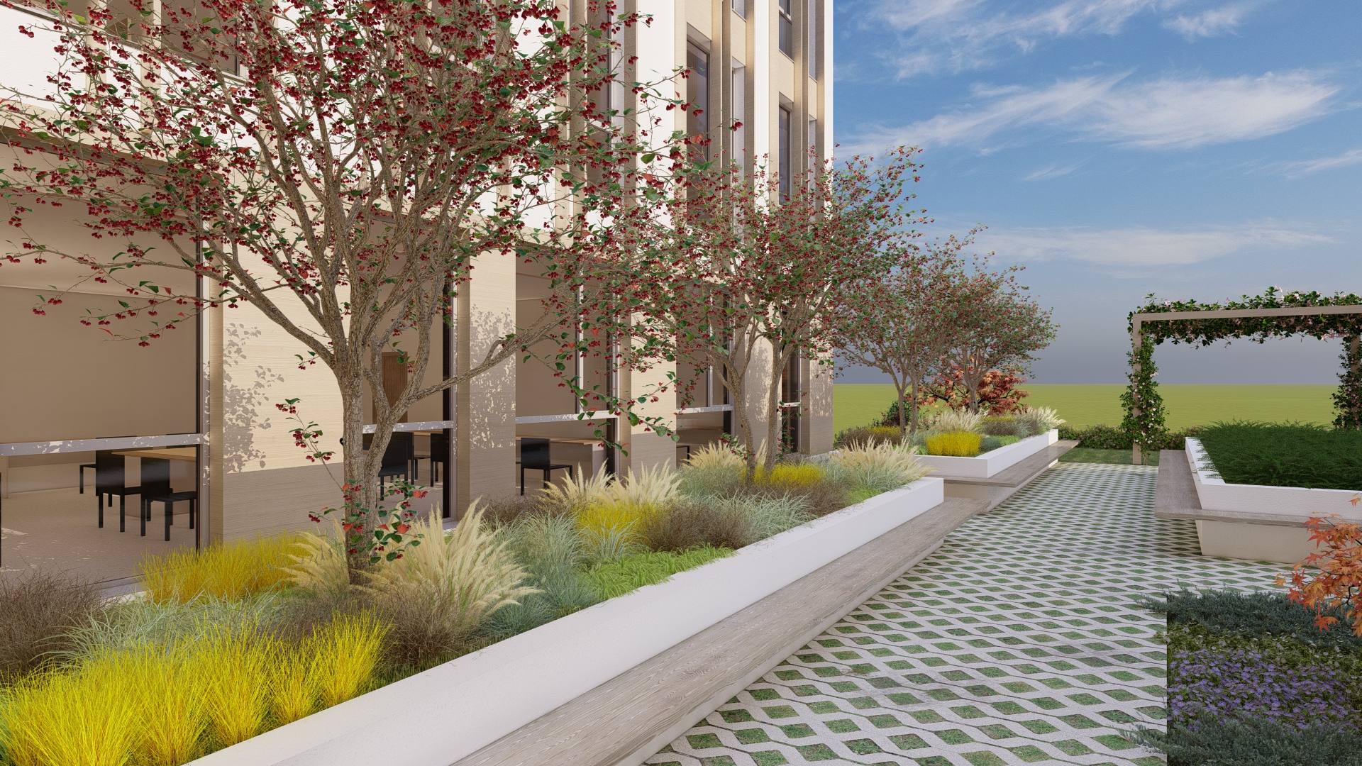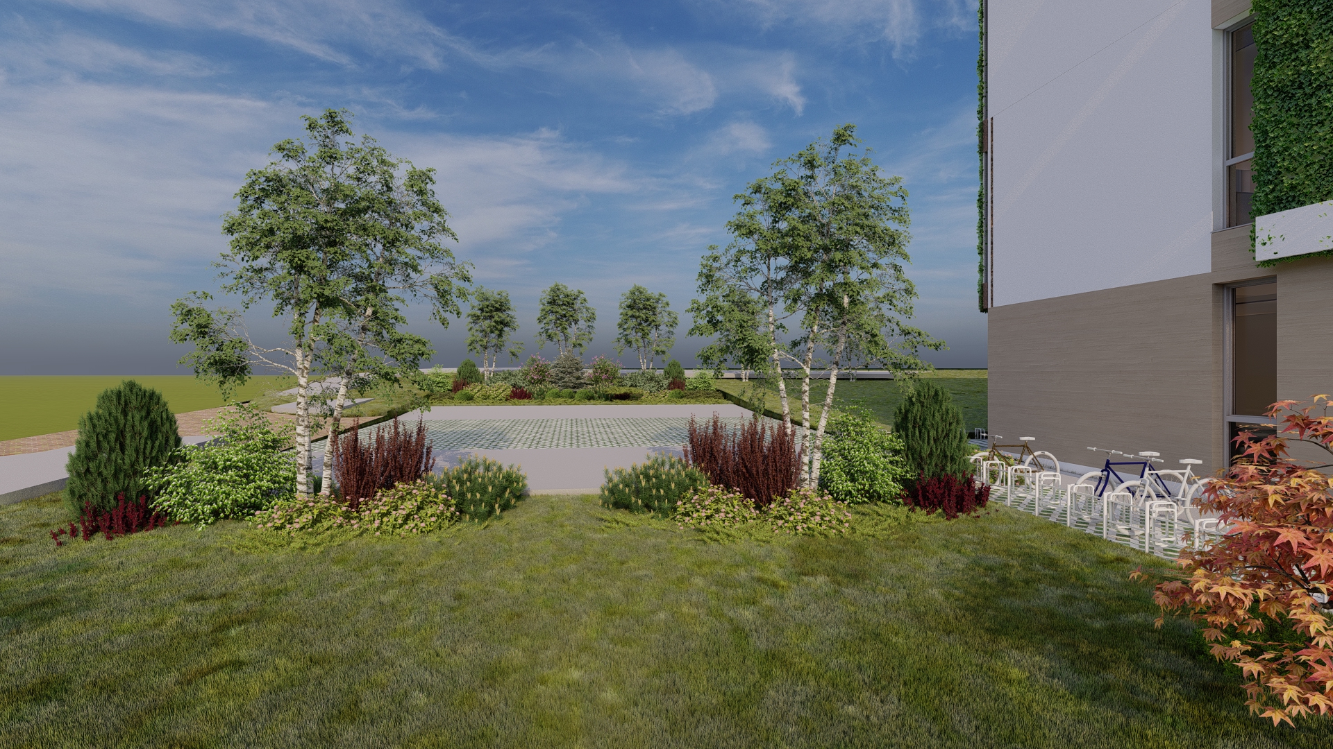 Amenajarea include alei permeabile, zone verzi plantate cu arbori, arbuști și plante perene, spații de stat și socializare din lemn, precum și insule vegetale care îmbunătățesc microclimatul și biodiversitatea. Compoziția urmărește un echilibru între funcționalitate, estetică și sustenabilitate, oferind elevilor un cadru plăcut pentru pauze, activități în aer liber și învățare non-formală.