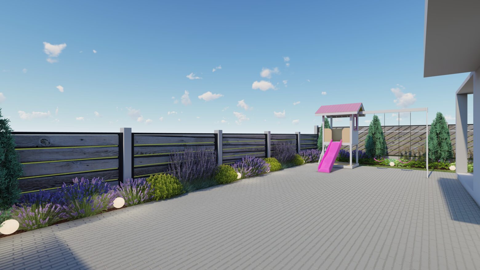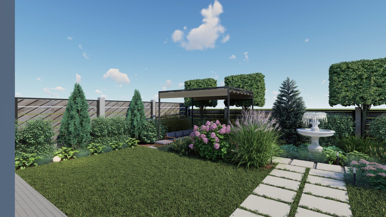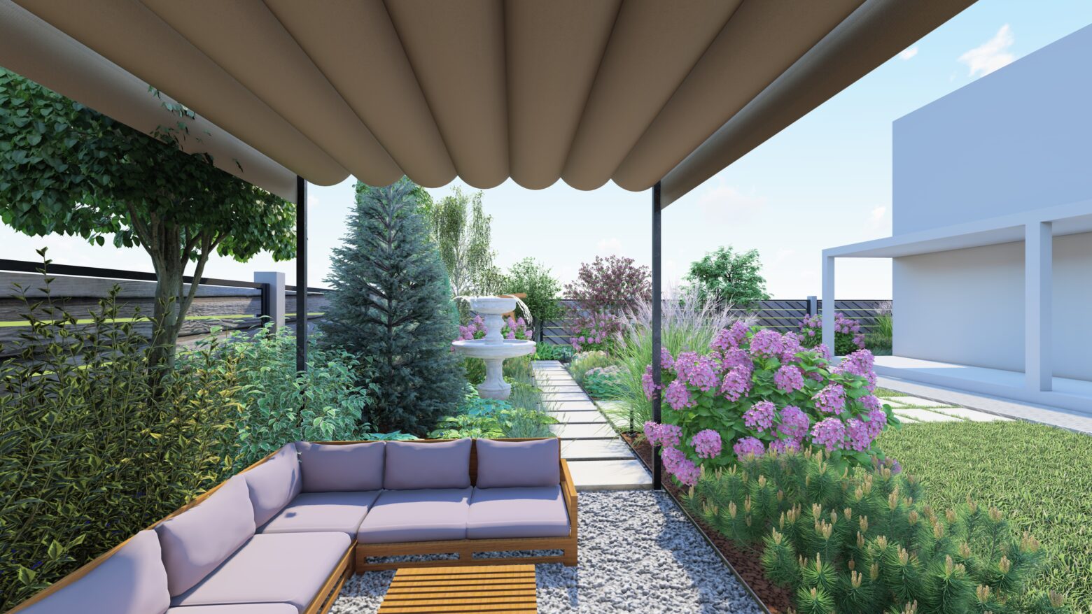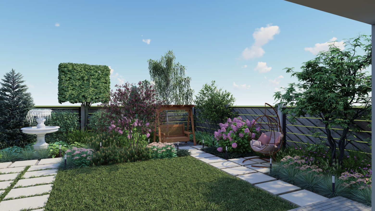 Lemnul, cald și natural, domină atmosfera și echilibrează precizia formelor, transformând grădina într-un spațiu primitor. În centrul acestui peisaj, apa devine sufletul locului — fântâna arteziană adună privirile, oferind o stare de calm continuu.