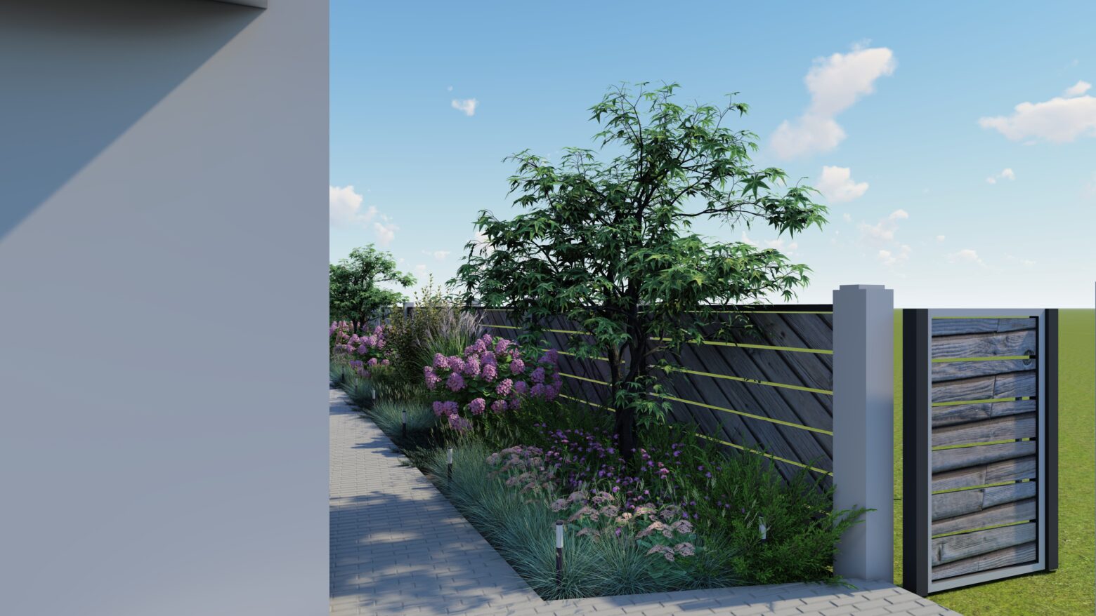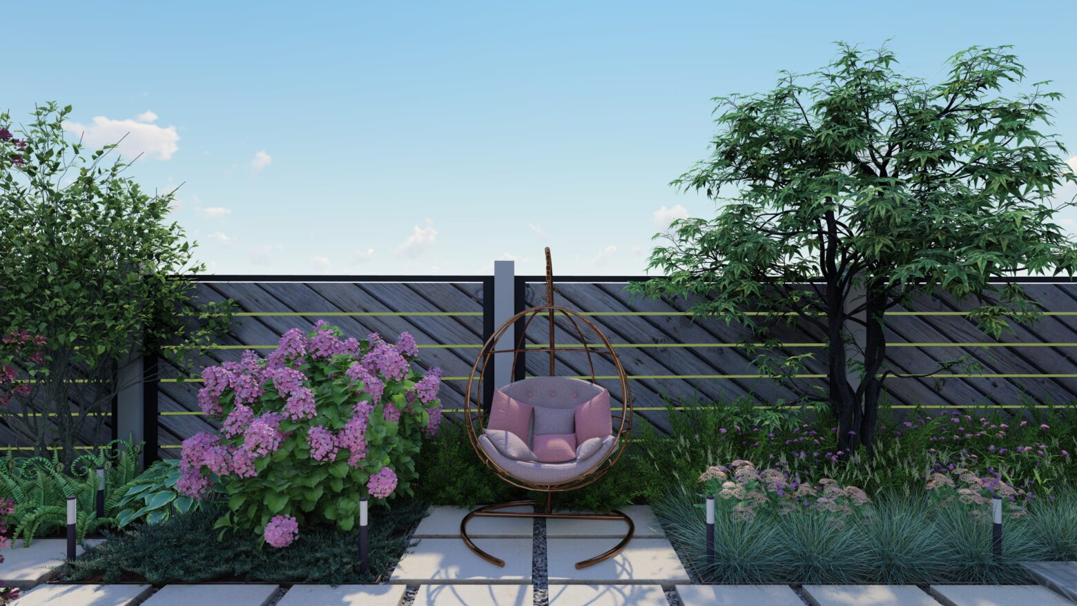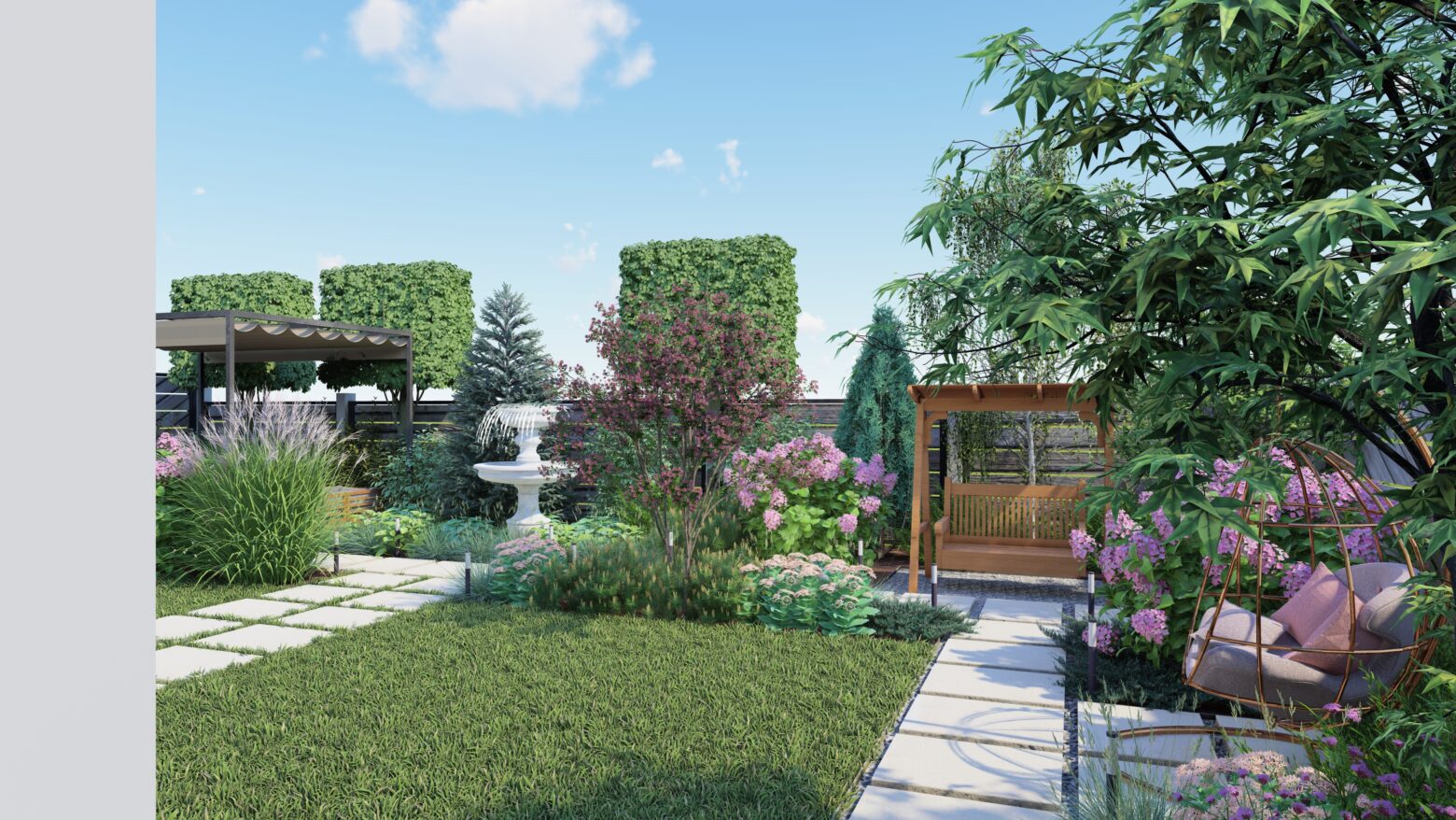 În această grădină, liniile drepte nu impun, ci ghidează. Compoziția geometrică creează un ritm calm, în care fiecare alee, fiecare colț verde și fiecare spațiu de repaus își găsește locul firesc. Structura nu aduce rigiditate, ci deschide drumul către mici refugii de liniște, conturate delicat de vegetație.