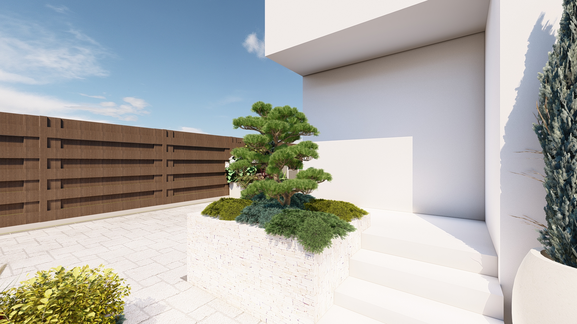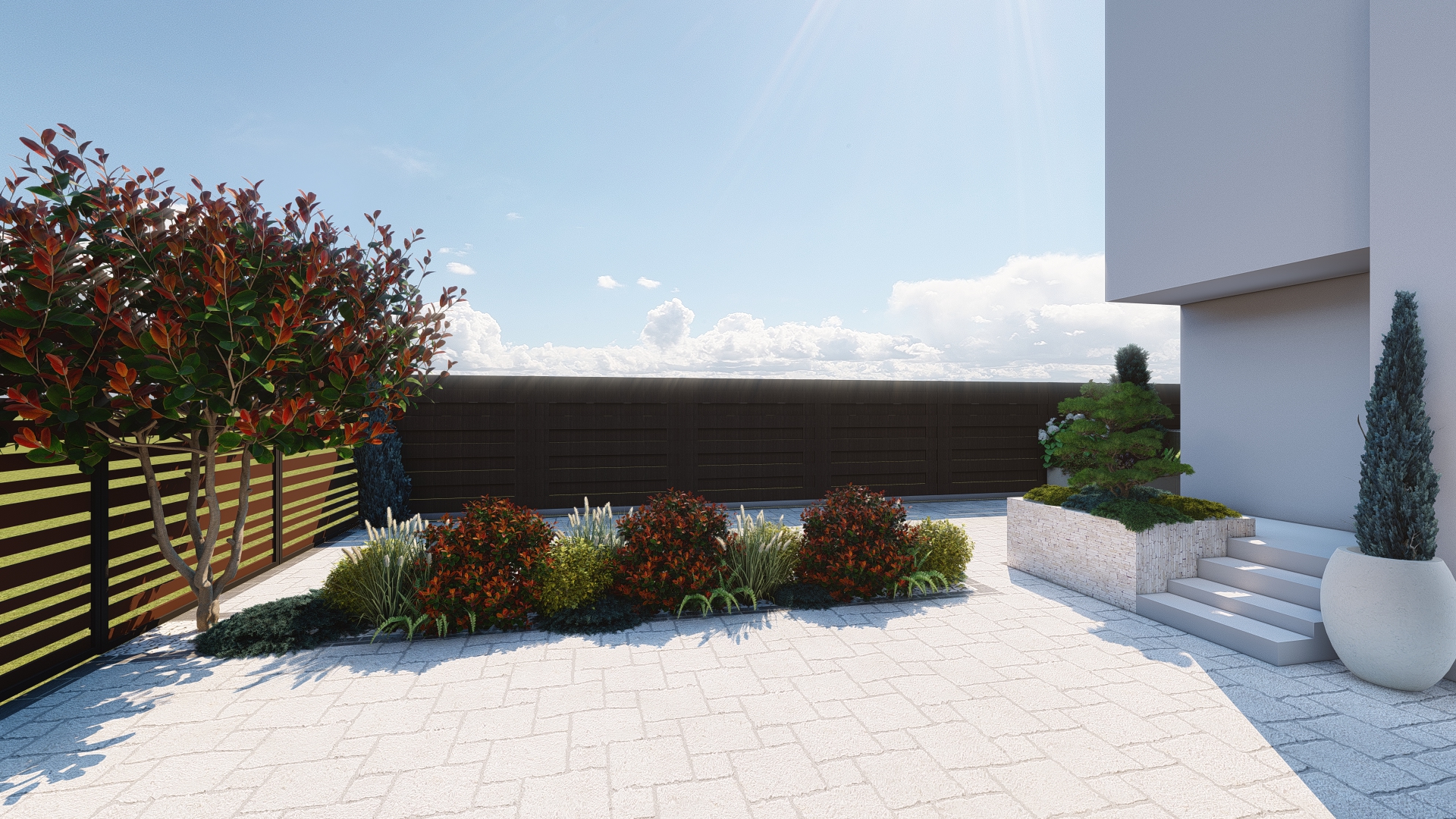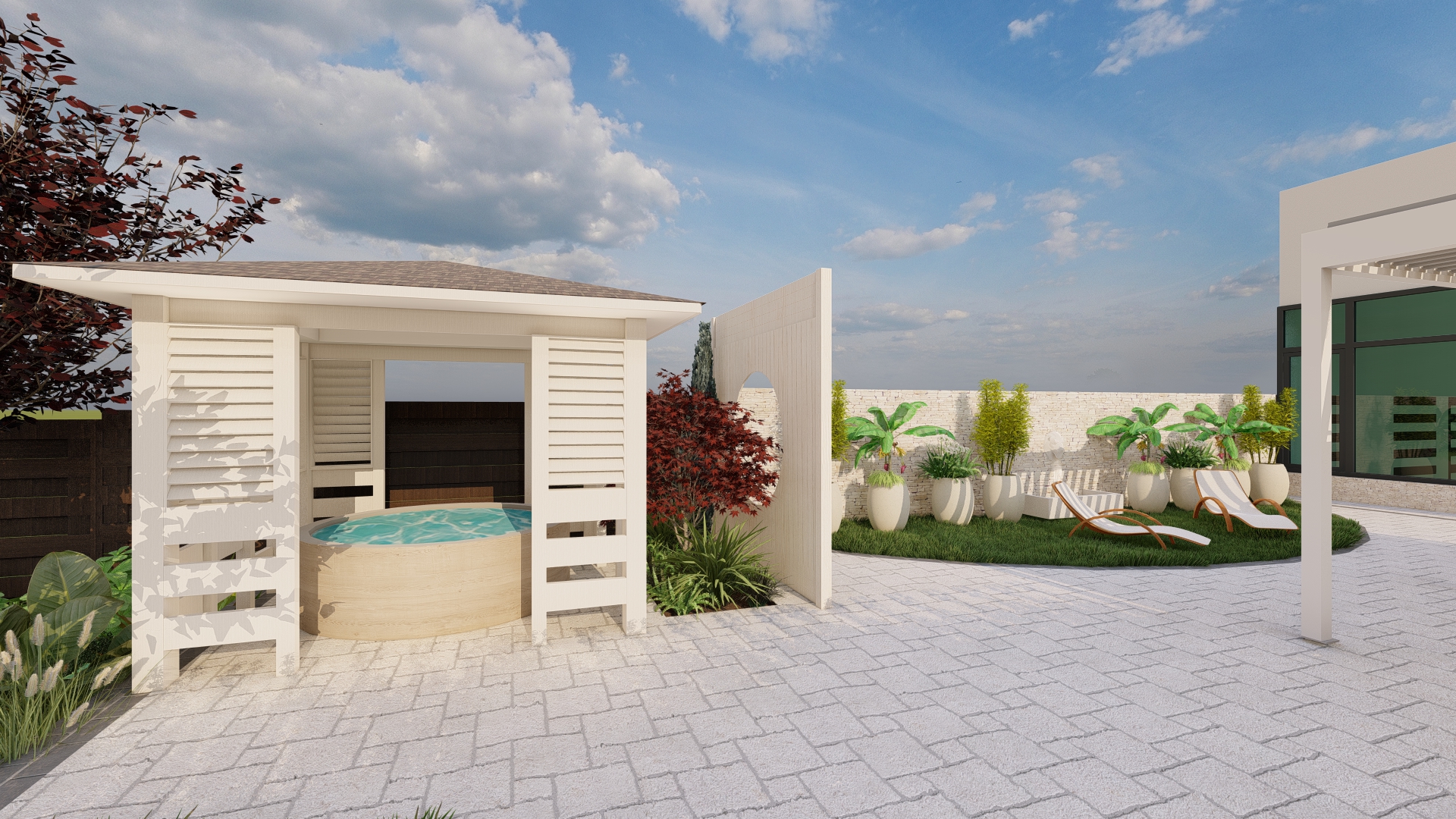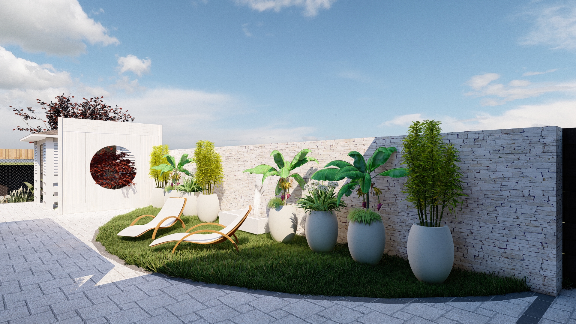 Prin organizarea strategică a spațiului, grădina este structurată în mai multe zone de odihnă și relaxare, fiecare oferind intimitate și confort, fără a încărca vizual ansamblul. Aleile, zonele de relaxare și elementele decorative sunt integrate astfel încât să ghideze parcursul și să amplifice senzația de refugiu și evadare.