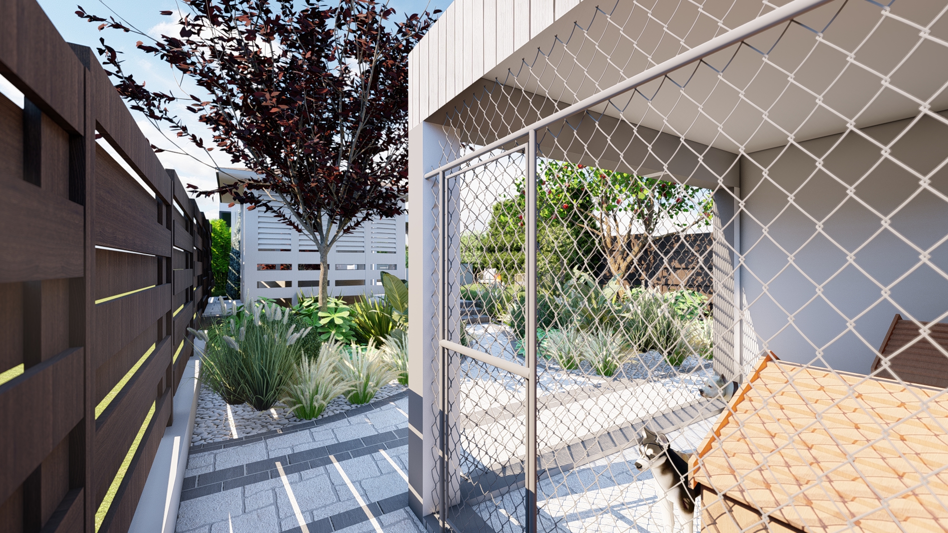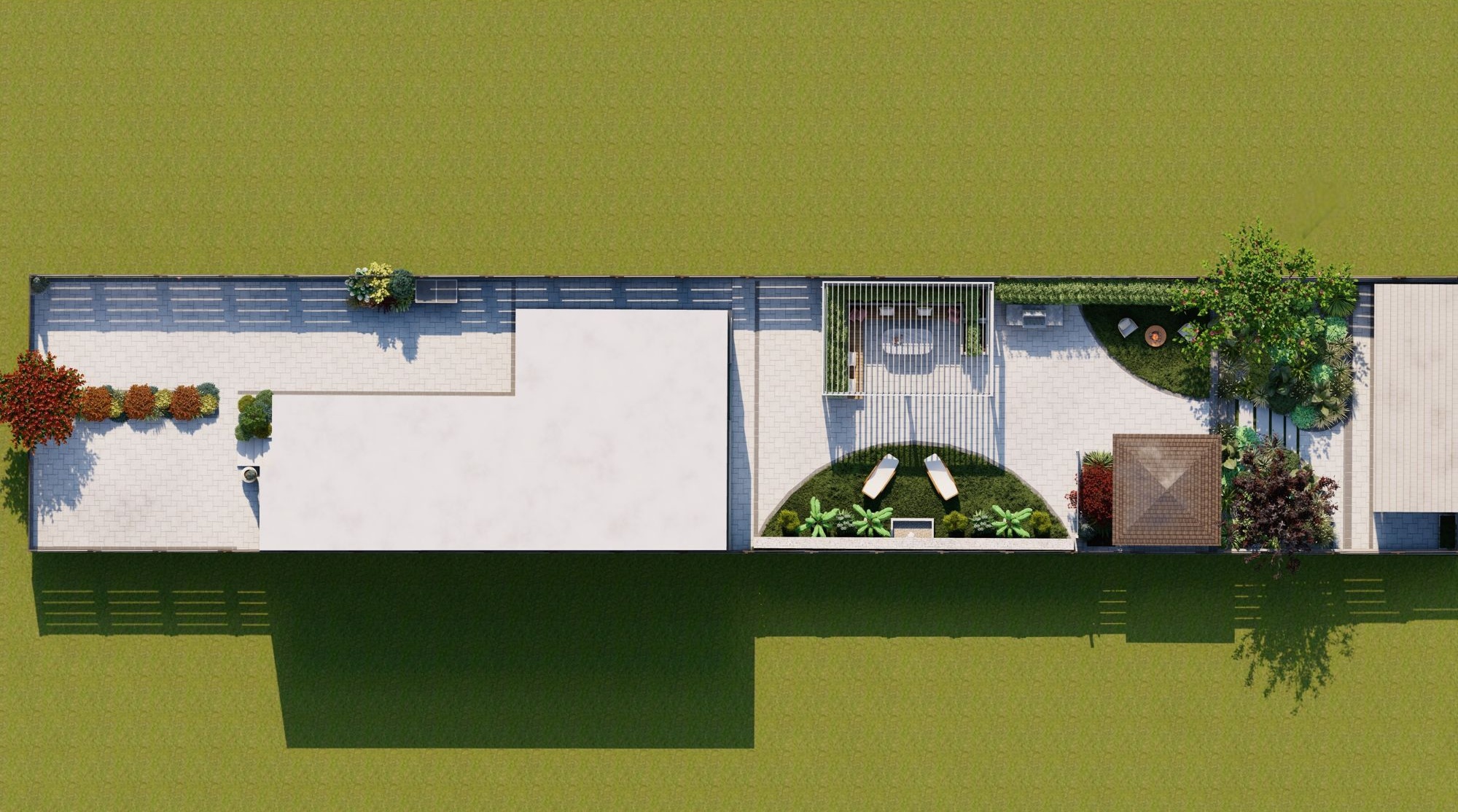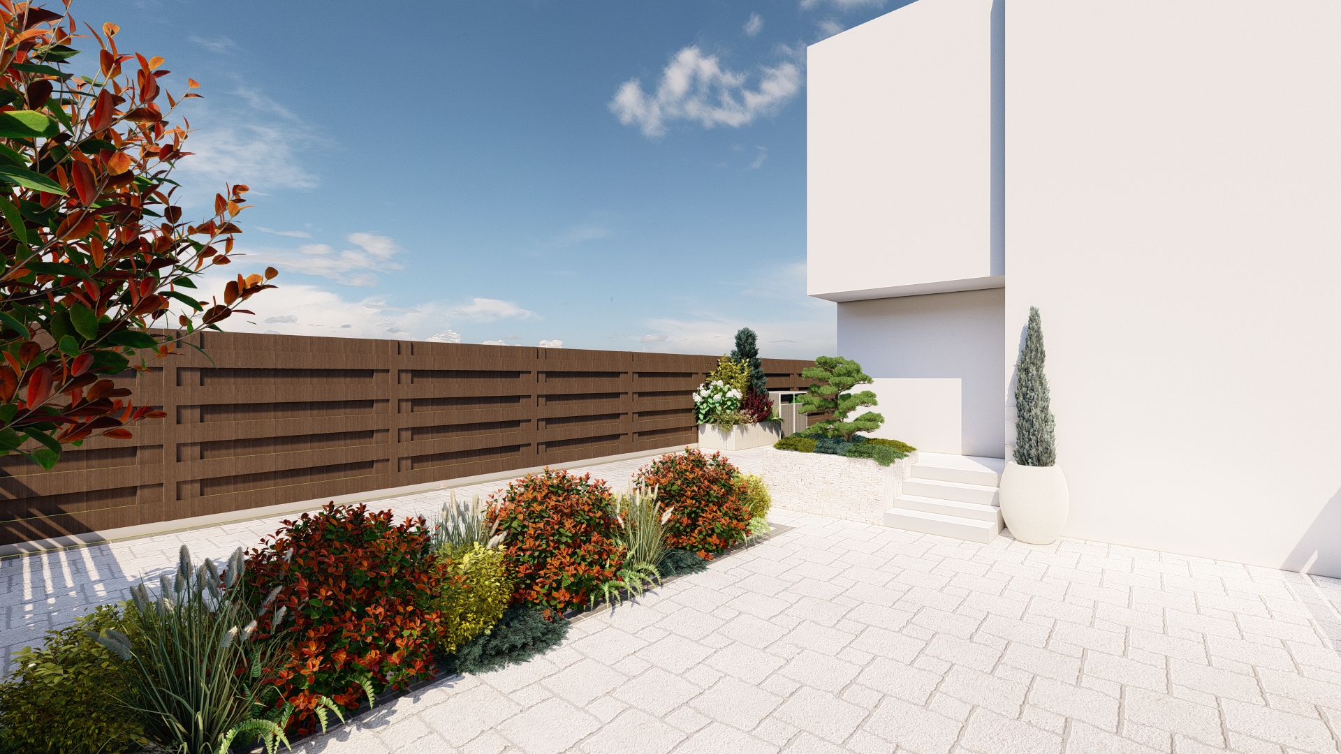 Prin organizarea strategică a spațiului, grădina este structurată în mai multe zone de odihnă și relaxare, fiecare oferind intimitate și confort, fără a încărca vizual ansamblul. Aleile, zonele de relaxare și elementele decorative sunt integrate astfel încât să ghideze parcursul și să amplifice senzația de refugiu și evadare.