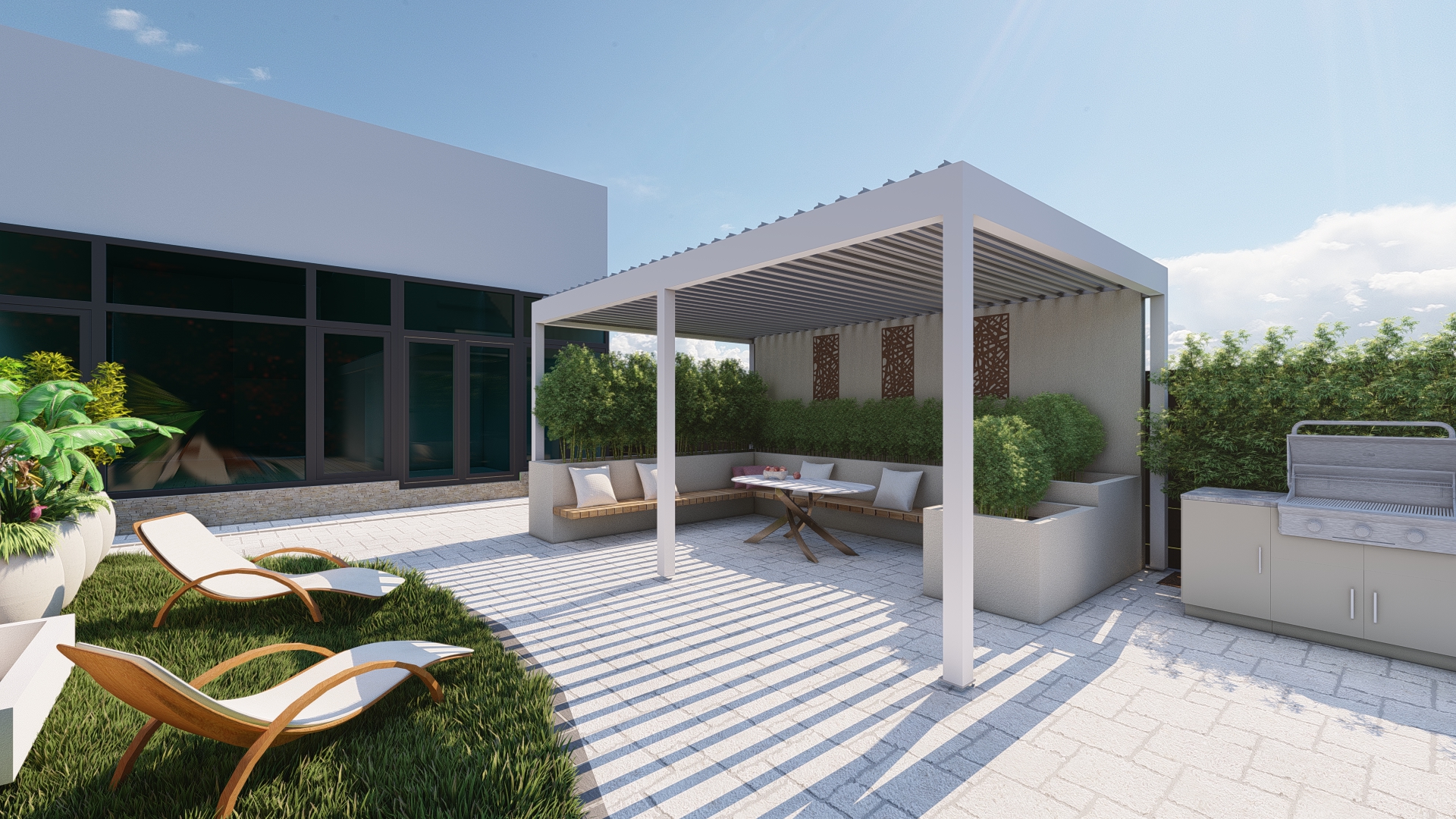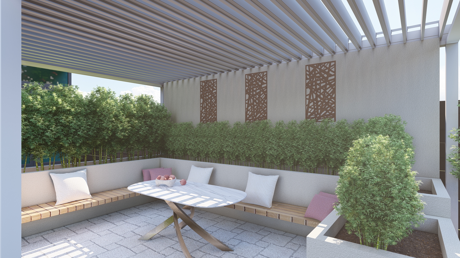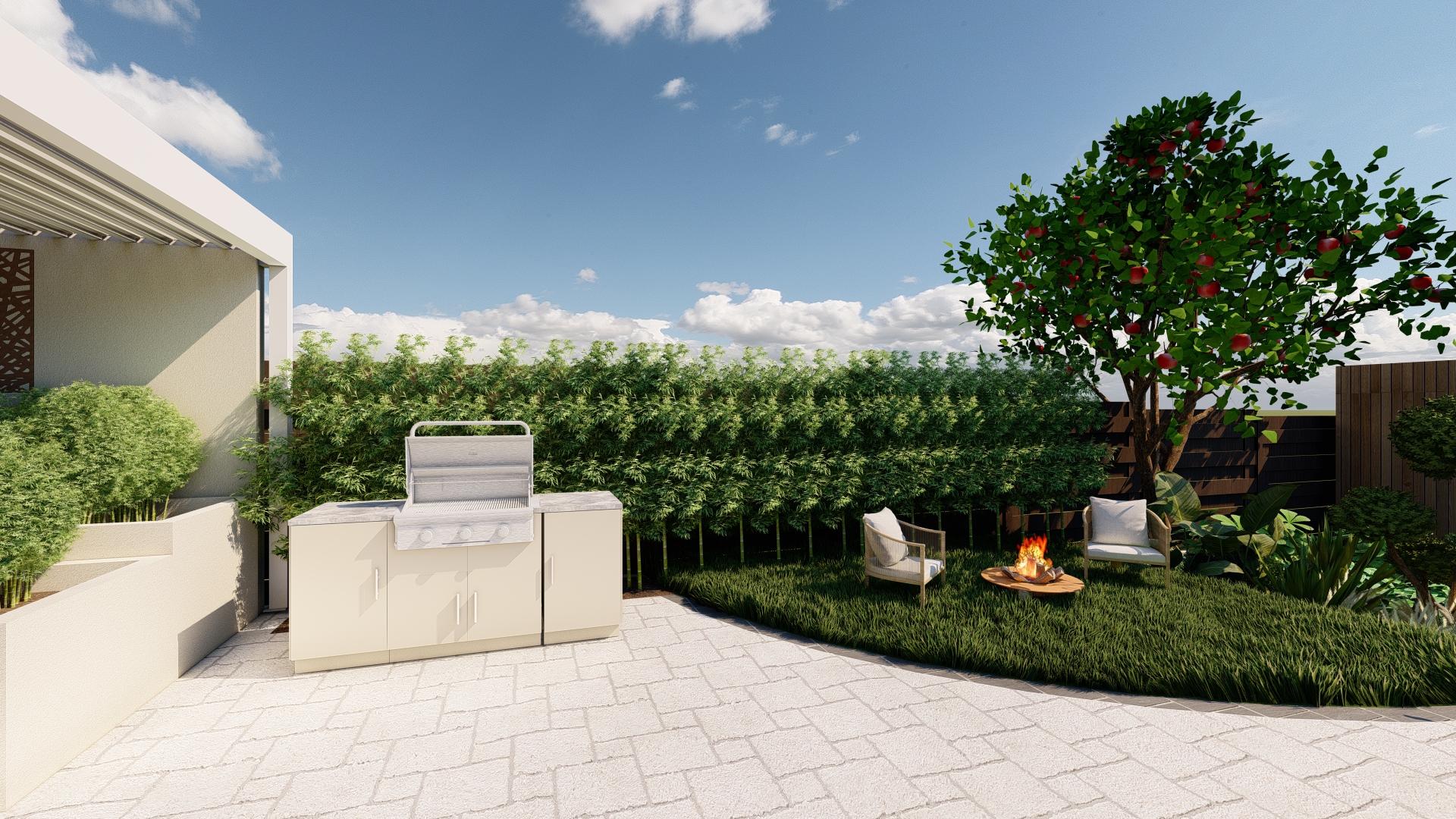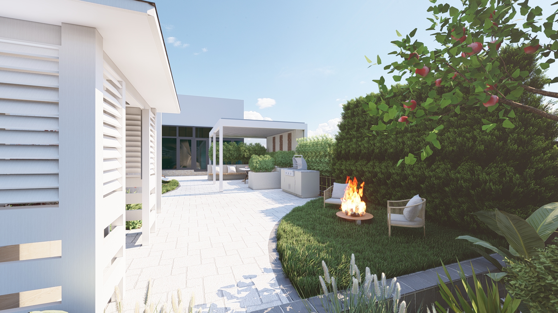 Prin organizarea strategică a spațiului, grădina este structurată în mai multe zone de odihnă și relaxare, fiecare oferind intimitate și confort, fără a încărca vizual ansamblul. Aleile, zonele de relaxare și elementele decorative sunt integrate astfel încât să ghideze parcursul și să amplifice senzația de refugiu și evadare.